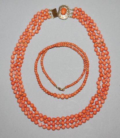 Dreisträngige Kette mit regelmäßigen Korallenkugeln und Schloss in vergoldetem Sterlingsilber, geziert mit einem Korallencabochon, L 46 cm sowie kleinere Kette mit verlaufenden Korallenkugeln, L 41 cm