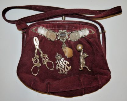 Dunkelrote Trachtentasche mit silberner Charivari - Kette, Traubenschere, Katze mit einem Ball spielend & Monogramm- Brosche mit Doppeladler - Krone