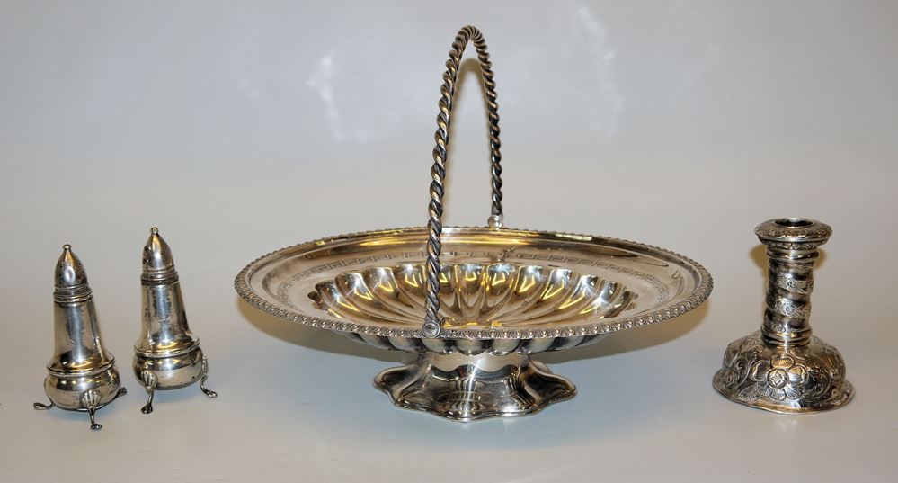 800er Silber, punziert, glockenförmiger Fuß, Schaft mit Girlanden in Torsion, reliefiert und ziseliert, H 11 cm, im Stil des spätes 17. Jhs., 127 g; 925er Silber, paar Salz- und Pfeffer-Streuer auf Rocaillefüßen, Boden gefüllt, H 11 cm, Crown Co., USA, dazu ovale, gefußte Schale mit Bügelhenkel, L 30 cm, versilbert