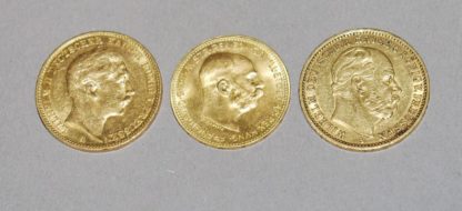 900er Gold, 7,92 g + 7,92 g, Dm 22,50 mm, einmal Vs. Portrait Wilhelm I. deutscher Kaiser König v. Preussen, Rs. Reichsadler, einmal Vs. Portrait Wilhelm II. deutscher Kaiser König v. Preussen, Rs. Reichsadler; 900er Gold, 6,78 g, 20 Kronen Franz Joseph I. 1915, Vs. Portrait Franz Joseph I. Kaiser von Österreich, Rs. Doppeladler