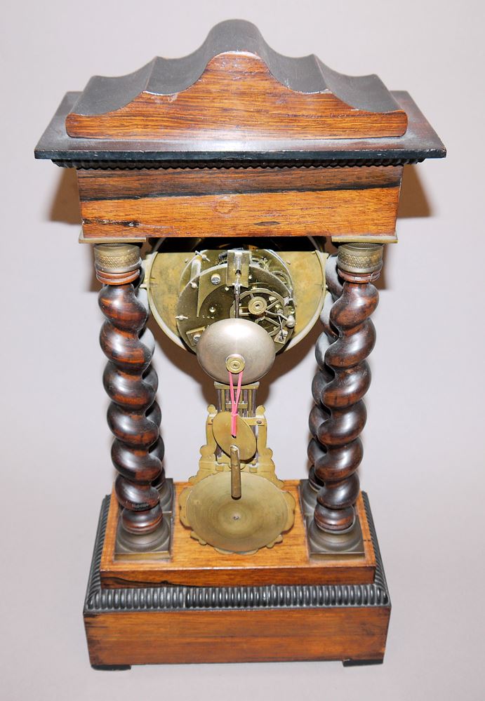 Pendule mit Spiralsäulen, Edelholzgehäuse mit floraler Marketerie, Basen, Kapitelle und Prunkpendel aus Bronze, Emailzifferblatt mit römischen Ziffern und goldenen Barockzeigern, Pendelwerk mit Pendelfeder und Halbstunden-Schlagwerk auf Glocke laufen an, Schlüssel anbei, gepflegter Zustand, H 49 cm