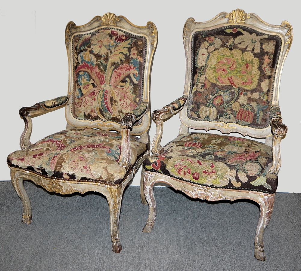 Paar Sessel mit Tapisserie-Bezügen, Periode Louis XV, Frankreich um 1750 Gegenstücke zweier Fauteuil à la Reine, die beschnitzten Hartholzrahmen weiß gefasst und teilvergoldet, florale Bezüge in Gobelin-Technik, Originale der Zeit mit Gebrauchs- und Altersspuren, Stabilität und Polsterung gut, 110 x 65 x 60 cm, Sitzhöhe 46 cm