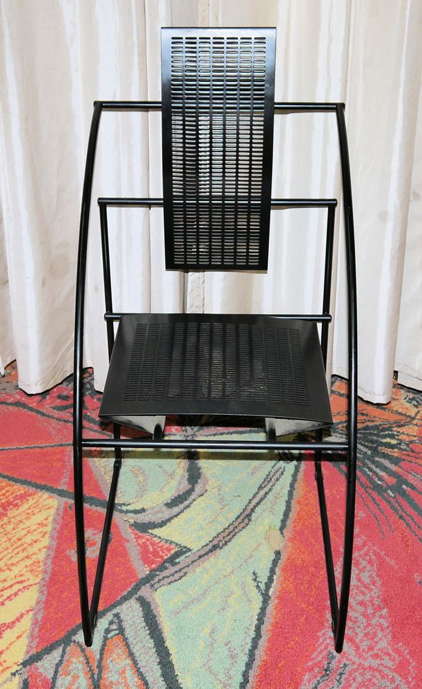 Mario Botta, Stuhl "La Quinta", für Alias, Mailand 1980er Jahre Entwurf Mario Botta 1985, postmoderner Stuhl aus schwarz lackiertem Rundstahl und auf Spannung montiertem Stahlblech, einwandfreier Zustand, 95 x 45 x 57 cm Mario Botta, *1943-, Schweizer Architekt und Professor, langjähriger Leiter der Accademia di Architettura der Università della Svizzera italiana in Mendrisio. Zu seinen berühmtesten Bauwerken zählen das San Francisco Museum of Modern Art und die Chiesa di San Giovanni Battista in Mogno-Fusio. Als man Botta fragte, ob er einen Stuhl entwerfen würde, war seine erste Reaktion "Noch einen Stuhl? Nach den hunderttausend Stühlen, die es schon gibt ?". Dann aber habe er begriffen, dass die Menschheitsgeschichte nichts anderes sei als die Geschichte des immer neuen Entwerfens von Gebrauchsgegenständen, die jedes mal gleich und immer auch verschieden sind, (Aus einem Interview mit Dieter Bachmann 1985). Versand mit regulärem DHL nicht möglich!