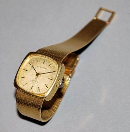 Elegante Damenuhr der 1970er Jahre, quadratisches Gehäuse, das goldfarbene Zifferblatt etwas fleckig, Gehäuse-Nr. 975003 296,Quarzwerk nicht geprüft, Gehäuse und Milaneseband 18kt Gelbgold, Ges.-Gew. 54 Gramm