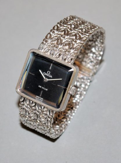 Exklusive Damenuhr mit quadratischem Gehäuse, nachtblauem Zifferblatt und facettiertem Saphirglas, Werk mit Handaufzug funktionsfähig, integriertes Geflechtband (max. Weite 17,5 cm), Gehäuse und Band 18kt Weißgold, sehr geringe Tragespuren, Ges.-Gew. 66,7 Gramm