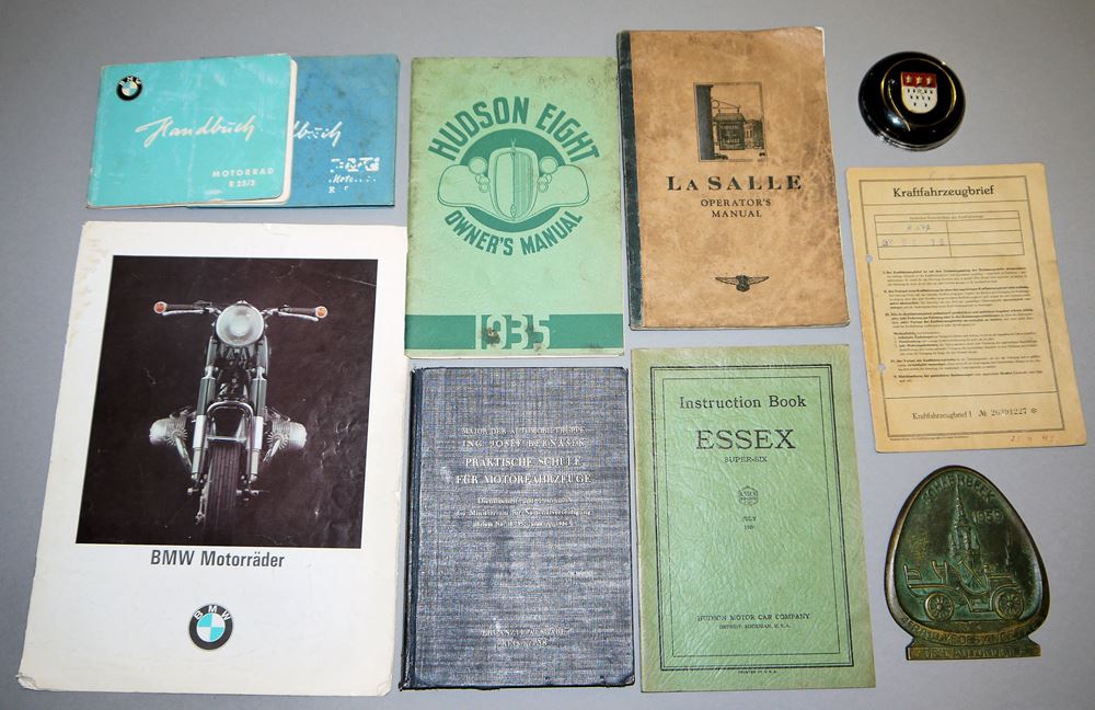 Zwei Handbücher in englischer Sprache der Hudson Essex Motors Company: für Hudson de Luxe Sedan (mit Schreiben der Firma an den amerik. General-Konsul 1935), für Essex Super-Six 1928; Handbuch von LaSalle Cadillac 1928; Praktische Schule für Motorfahrzeuge von Josef Bernasek 1930; zwei Handbücher für BMW Motorrad R25, Werbeheft BMW Motorräder, dazu Bronzeplakette Rallye Schaerbeek 1959 und Hupenknopf mit Stadtwappen Köln für VW-Käfer 1952
