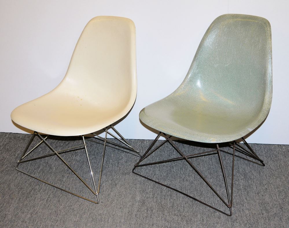 Entwurf Charles und Ray Eames 1950, zwei niedrige Lounge-Sessel der Version LSR, die Sitze aus weißem bzw. hellgrauem Fiberglas in gutem Zustand, die verchromten bzw. schwarz gelackten Drahtgestelle oberflächlich flugrostig