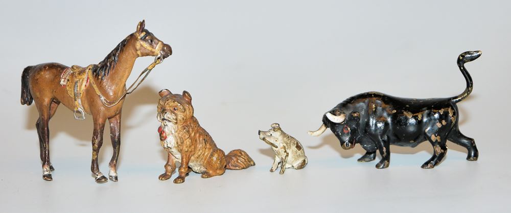 4 originale Wiener Bronzen um 1900 Wilder Stier, "grimmiger" Hund, edles Reitpferd und kleines Schwein, alle Bronze kaltbemalt
