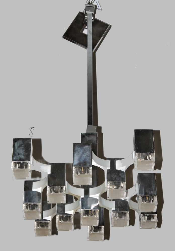 Entwurf Angelo Gaetano Sciolari (1927 - 1994), italienischer Industriedesigner, futuristische Deckenleuchte aus verchromtem Metall, 12 gestufte, würfelförmige Leuchtkörper mit Diffusor-Einsätzen aus Plexiglas, 105 x 45 x 45 cm, Elektrifizierung nicht geprüft