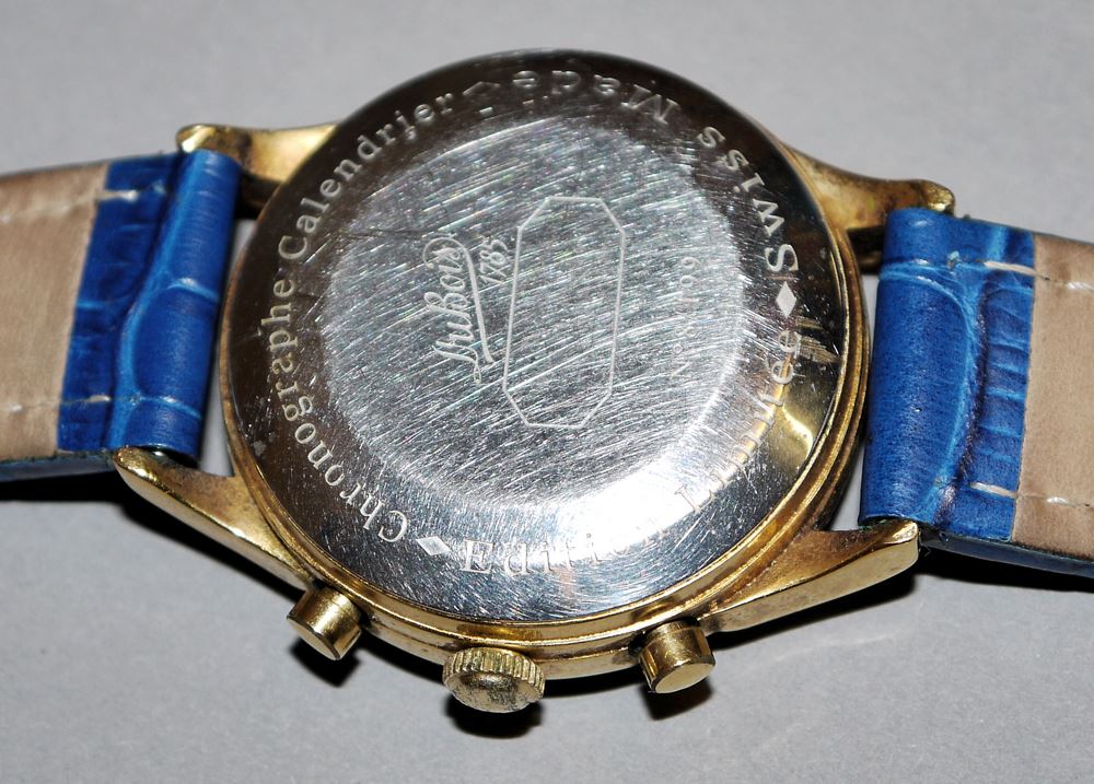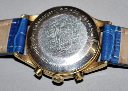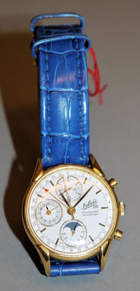 Chronograph mit vergoldetem Gehäuse und Stahlboden (Dm 35 mm), Automatik-Werk läuft, limitiertes Sondermodell No. 8/199, weißes Zifferblatt mit goldfarbenen Indizes, Tachimeter, Mondphasenanzeige, Stunden- und Minuten-Zähler, Wochentag- u. Monatsanzeige, zentraler Datums-Zeiger, kl. Sek. bei 9. dunkelblaues Lederband, mäßig getragener Zustand