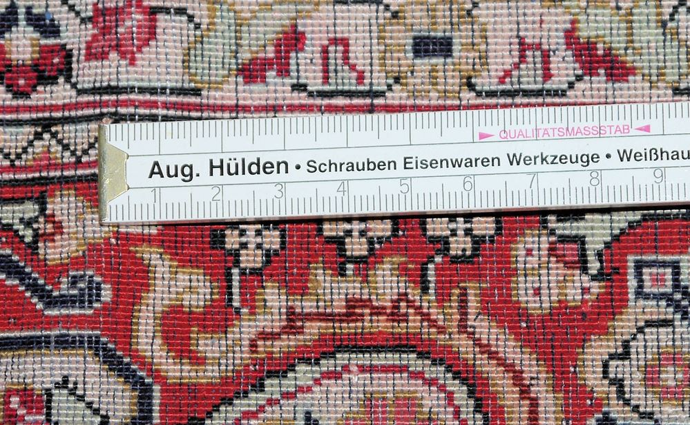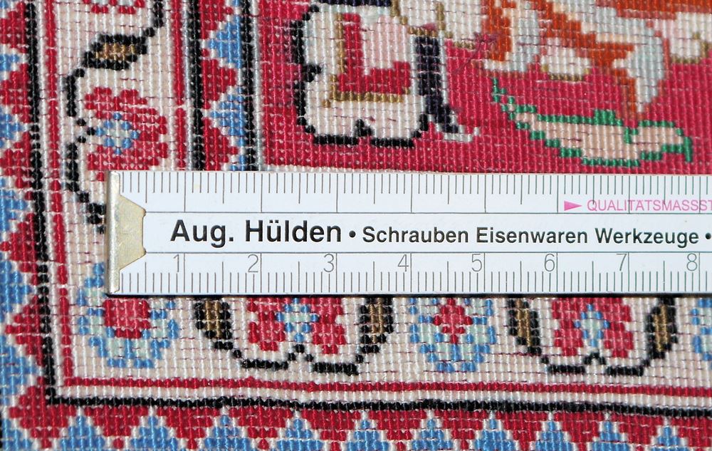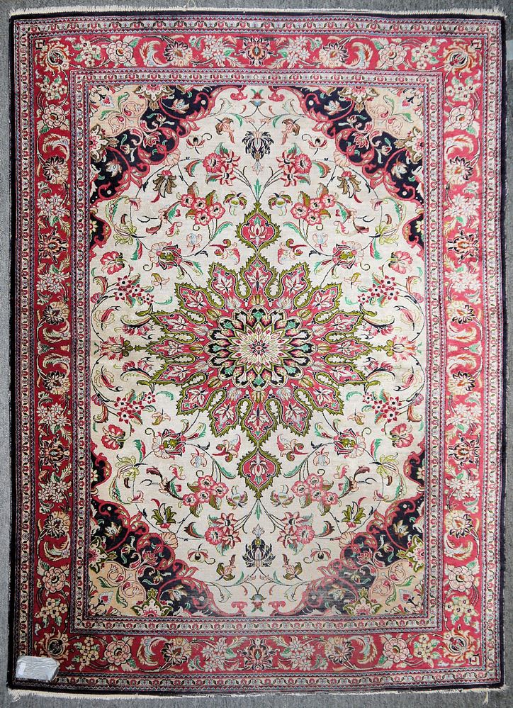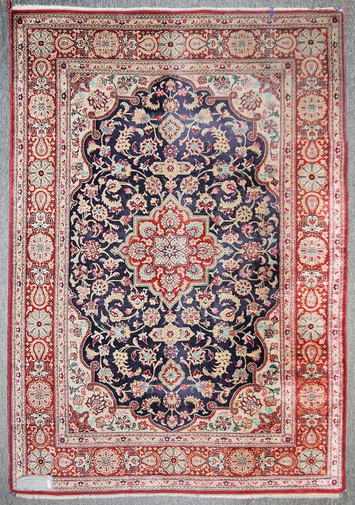 Zwei Seiden-Brücken, Täbris und Ghom, Persien, ca. 60-70 Jahre alt Side/ Seide, Täbris cremefarbengrundig mit Altrosa, Grün und Dunkelblau, dreifache Bordüre mit Ranken, im Mittelfeld Medaillon umgeben von Blumenranken, 150 x 103 cm, größere Stellen gleichmäßig abgetreten, Fransen kurz; Ghom dunkelblau- und beigegrundig mit Rot, Hellblau usw., dreifache Bordüre mit Ranken, im Mittelfeld Medaillon u. Zwickel, Rankenwerk, 152 x 100 cm, Fransen kurz, stellenweise leicht abgetreten