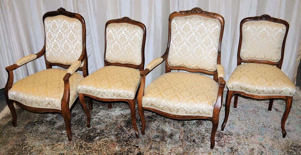 Zwei Armlehnsessel und zwei Stühle mit Nussholzrahmen und geschnitztem Lehnenabschluss, modern gepolstert und bezogen in cremefarbenem Brokat, alle in stabilem und einwandfreiem Zustand, Sitzhöhe 41 & 45 cm