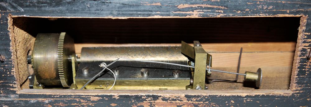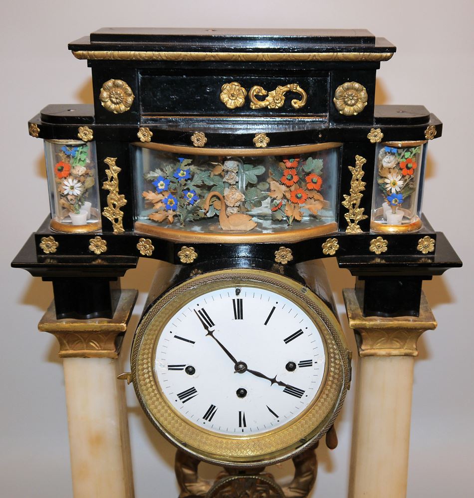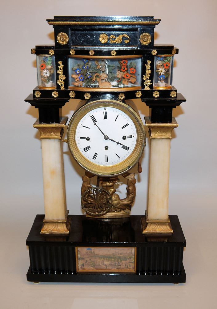 Wiener Portaluhr mit Spielwerk von Frantisek Hosek, Österreich/Ungarn um 1830/40 Pendule des Biedermeier, das ebonisierte Holzgehäuse mit goldgelackten Teilen, Alabastersäulen, im Sockel ein Stich mit Ansicht des Wiener Augartens, im Sturz drei verglaste Eingerichte mit Blumen und Schwan, Walzengehäuse mit Emailzifferblatt und römischen Ziffern, das Werk mit Fadenaufhängung und Scheibenpendel, Viertelstunden-Schlagwerk auf zwei Spiralfedern, Werke laufen an, im Sockel ein funktionsfähiges Walzenspielwerk für mehrere Melodien, die Fadenverbindung zum Stunden-Auslösen des Spielwerks gerissen, im Rückendeckel ein Stempel des "Frantisek Hosek Hodinar" (tschech. Uhrmacher), Hersteller oder Rhabilleur, Schlüssel anbei, Gehäuse wurde alt überarbeitet, wenige Zierteile fehlen, H 64 cm