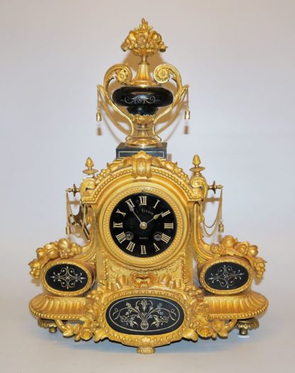 Elaboriertes Gehäuse aus vergoldetem Metallguss mit gravierten Einlagen aus schwarzem Stein und aufsitzendem Krater, ebenfalls schwarzes Zifferblatt mit römischen Ziffern und Uhrmachername, Werk mit Pendelfeder und Halbstunden-Schlagwerk auf Glocke, beide Werke laufen, Schlüssel anbei, sehr schöner Originalzustand, H 43,5 cm