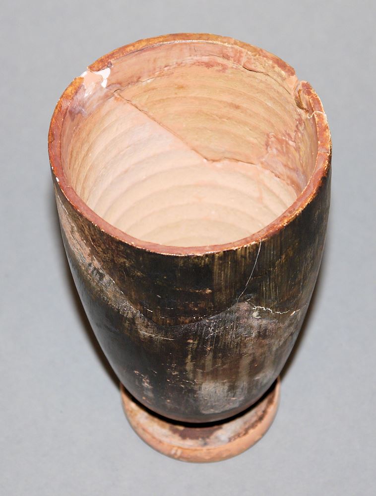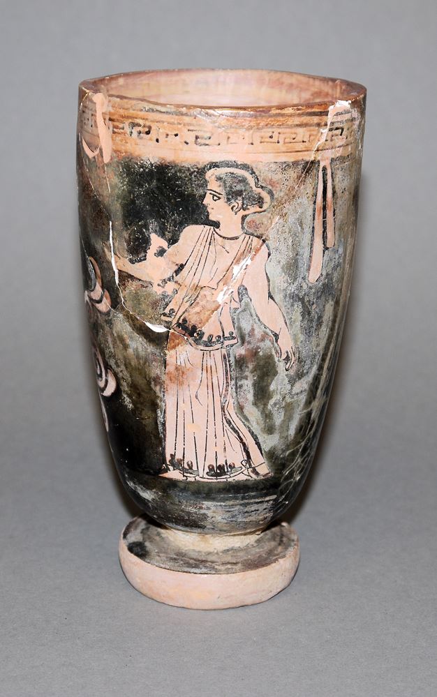 Körper einer Lekythos, in sekundärer Verwendung unmittelbar unter Schulteransatz abgesägt. Unter der Schulter umlaufender einfach Mäander, im Hauptfries stehende Frau in Peplos mit ausgestrecktem rechten Arm nach rechts blickend, davor aufrechte Ranke mit Voluten, Fond und Binnenzeichnungen in schwarzem Firnis, H 14,5 cm, aus 5 Fragmenden zusammengesetzt, restauriert, rotbrauner Ton, stellenweise verbrannt, Provenienz: aus alter Heidelberger Sammlung, mit schriftlicher Bestätigung über alter der Sammlung.