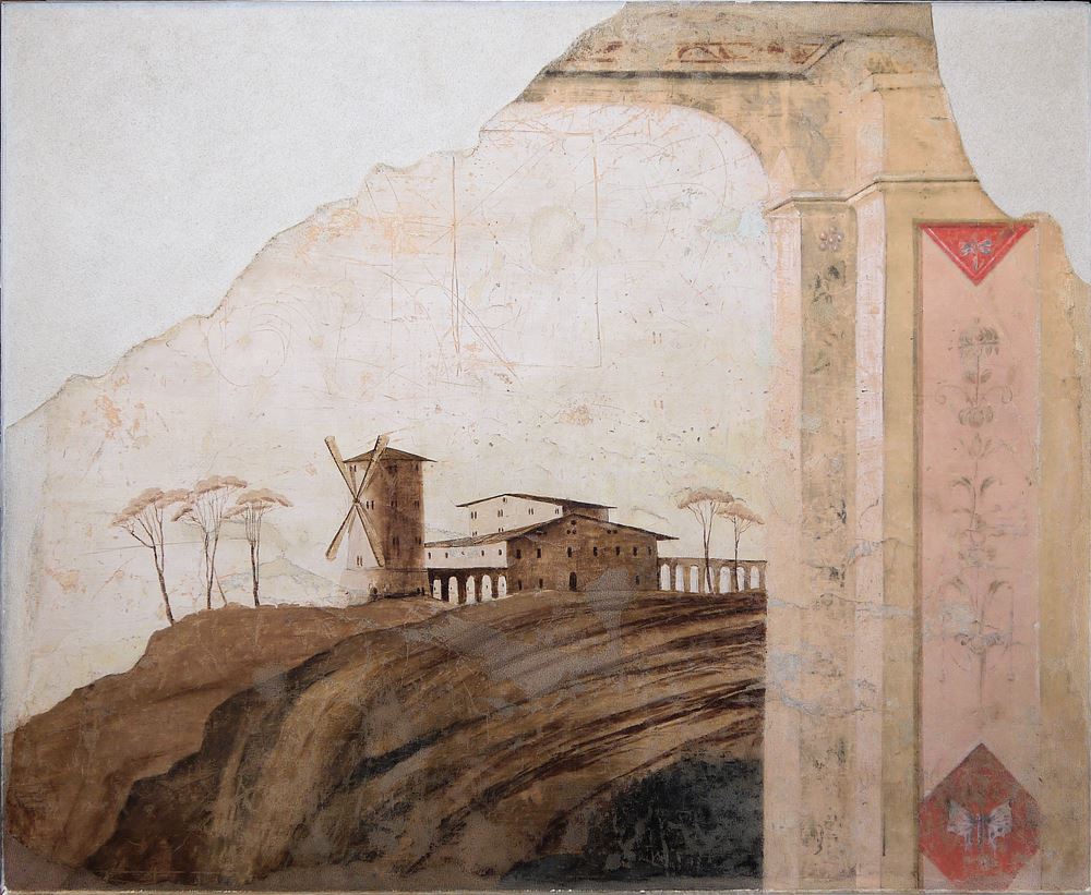 Fragment eines Wandfreskos mit Architektur und Ausblick auf Landschaft mit Pinien, Villa und Windmühle, in der Art des 2. pompejanisches Stils (Architekturstil), 102 x 132 cm, im Metallrahmen, aus dem "Attico" dem Palazzo der Familie Proli in Tarquinia