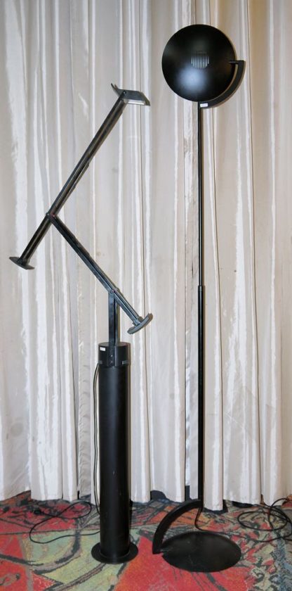 Richard Sapper, Stehleuchte "Tizio" für Artemide und Mario Barbaglia und Marco Colombo, Stehleuchte "Eco Terra" für Italiana Luce Richard Sapper, 1932 - 2015, Entwurf 1972, Niedervolt-Lampe "Tizio", die seltene Variante mit Standfuß (abnehmbar), in jede Position ausgewogen verstellbar, als Designklassiker aufgenommen in MET und MoMA, guter Zustand, max. H ca. 185 cm sowie Mario Barbaglia und Marco Colombo, Entwurf 1989, Stehleuchte "Eco Terra", Eisen, schwarz lackiert, höhenverstellbar und mit schwenkbarem Schirm als Deckenfluter, ebenfalls Niedervolt mit Dimmer, max. H 177 cm, funktionsfähig, Elektrifizierungen nicht geprüft