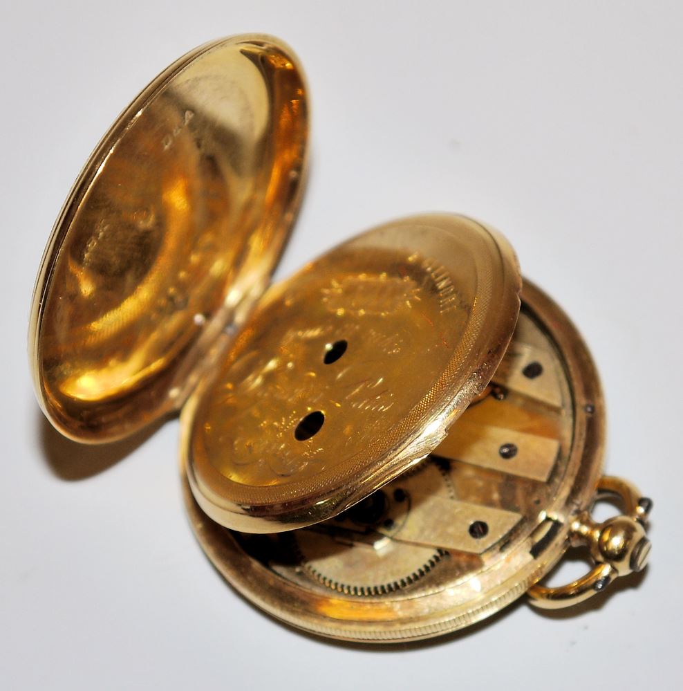 Damentaschenuhr, Gold, um 1900 18kt Gelbgold, Deckel außen emailliert und ziseliert, weißes Emailzifferblatt, Schlüsselaufzug, läuft, Gesamtgewicht 30,52 g