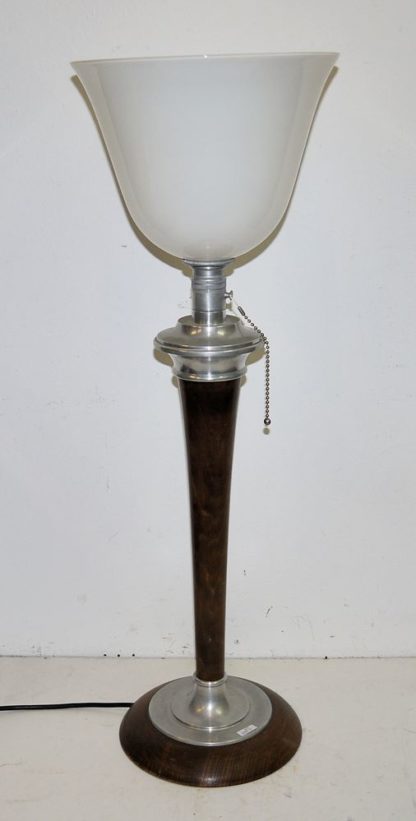Salonlampe von Mazda, Frankreich 1930er Jahre Tischlampe mit Kelchschirm aus Milchglas auf naturbraunem Holzschaft mit Aluminium-Montur, modern elektrifiziert, nicht geprüft, H 77,5 cm