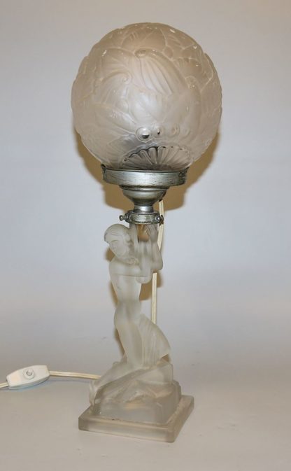 Der Schaft aus mattiertem Pressglas in Form eines weiblichen Aktes, der Kugelschirm mit floralem Dekor, Marriage, Fassungen und Elektrifizierung geändert (E27 Fassung), nicht geprüft, H 41,5 cm