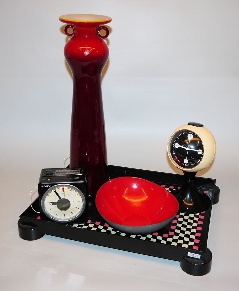 Fünfmal Vintage vom Space Age bis zur Postmoderne Ein Tablett des Memphis-Designers Matteo Thun für WMF aus Polytherm-Kunststoff (33 x 44 cm); eine Glasvase des polnischen Glaskünstlers Kazimierz Krawczyk, *1948- (H 45 cm); ein kultiger Radiowecker von Sony, Modell ICF-A15L, mit Batteriebetrieb und funktionsfähig (H 11 cm); ein Kugelwecker aus Kunststoff, ebenfalls funktionsfähig (H 21,5 cm) sowie eine "Krenit"-Schüssel von Herbert Krenchel (20,5 x 18,5 cm) Herbert Krenchel (1922 - 2014) war ein dänischer Materialforscher und Designer, er entwarf die Schüsselserie Krenit für die dänische Firma Torben Ørskov & Co, mit der er 1954 eine Goldmedaille bei der Mailänder Triennale gewann. Die Schüsseln aus Metall mit Emailbeschichtung waren stilbildend für die industrielle Produktion von Haushaltsartikeln und typisch für das schlichte skandinavische Produktdesign. Heute sind sie begehrte Sammlerobjekte.