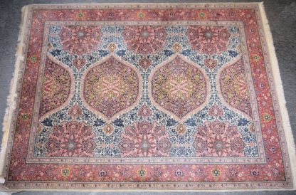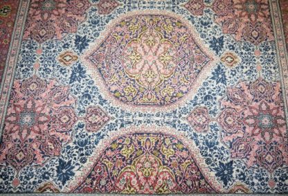 Feiner Orientteppich Keschan, Persien, ca. 70-80 Jahre alt Wolle/Baumwolle, naturweiß-, rot- und dunkelblaugrundig mit Hellblau, hellgrün usw., siebenfache Bordüre mit Ranken, im Mittelfeld Medaillons umgeben von monochromen Ranken, sehr feine Knüpfung, 263 x 200 cm, guter Zustand