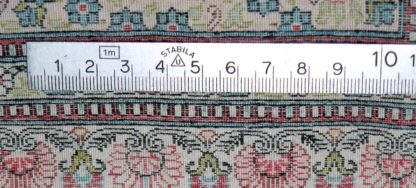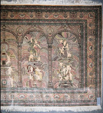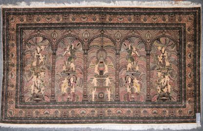 Seide/Seide, beigegrundig mit Rot, Blau, Hellgrün usw., sechsfache Bordüre mit Ranken und Blumenvasen, im Mittelfeld quer fünffache Nischenarchitektur, darin vor blühenden Zweigen Aphrodite auf brunnenartigem Sockel, umgeben von Eroten, 137 x 245 cm, sehr feine Knüpfung, Ösen zur Wandaufhängung