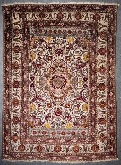 Orientteppich Kayseri, Türkei & Kelim Sumak Gashgai, Persien Wolle/Wolle, naturweiß- und braungrundig mit Dunkelrot usw., siebenfache Bordüre mit Ranken, im Mittelfeld Medaillon, umgeben von Palmetten, Lanzettblättern und Blumenranken, 250 x 160 cm, guter Zustand; Wolle, Bordüren bestickt, Mittelfeld mit Zickzackmuster in Naturweiß, Brauntönen, Petrolfarben, 160 x 156 cm