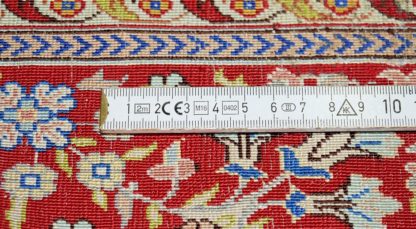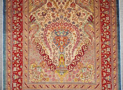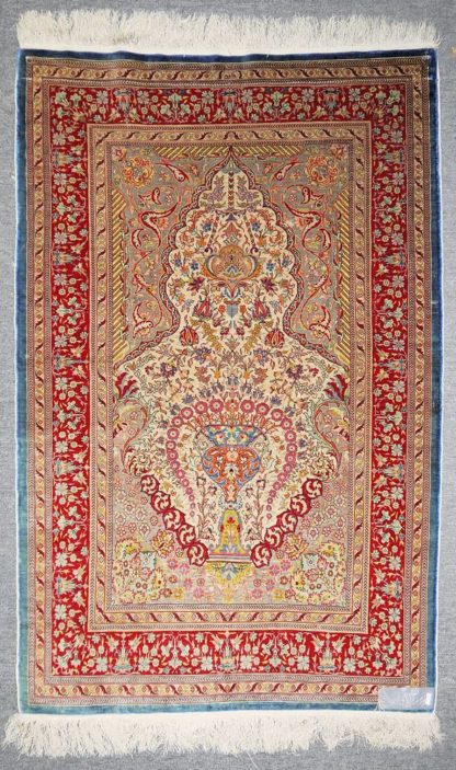 Seide/Seide, Gebetsteppich, beige-, hellblau- und rotfrundig mit Türkis, Rosa, Hellgrün usw., dreifache Bordüre mit Ranken und Blumen, im Mittelfeld Mihrabnische mit Ampel, darunter Blumenvase, umgeben von Blumenzweigen und Ranken, 151 x 93 cm