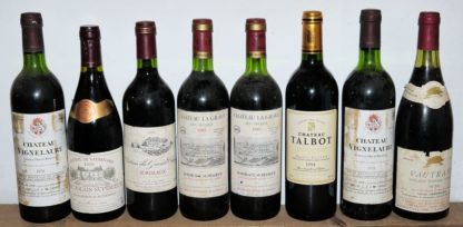 - 2 Fl. Château Vignelaure Coteaux d'Aix en Provence, 1978, No. 184002 und No. 184997, beide Upper Mid Shoulder, Etiketten fleckig, minimale Randläsuren, Kapseln intakt, einmal mit kleiner Schubfalte - Vautrait, Louis Lesanglier Beaune, 1978, Füllstand 2,4 cm, Etikett beschädigt u. fleckig, Kapsel intakt - 2 Fl. Château La Grave Duc Decazes, Bordeaux Supérieur, 1983, Top Shoulder u. Upper Mid Shoulder, Etikett fleckig u. mit Randläsur, Kapsel intakt mit kleiner Schubfalte - Château du Grand Champ Bordeaux 1986, Teillet à Castelveil, Into Neck, Etikett fleckig, mit Einriss, Kapsel intakt - Château Talbot, Grand Cru Classé, Saint Julien 1994, Into Neck, Etikett sauber, intakt, Kapsel intakt - Château de Vaurenrard Beaujolais Supérieur 1995, Cuvée du Baron de Richemont, Füllstand 0,7 cm, Kapsel intakt, Etikett sauber, mit Läsuren