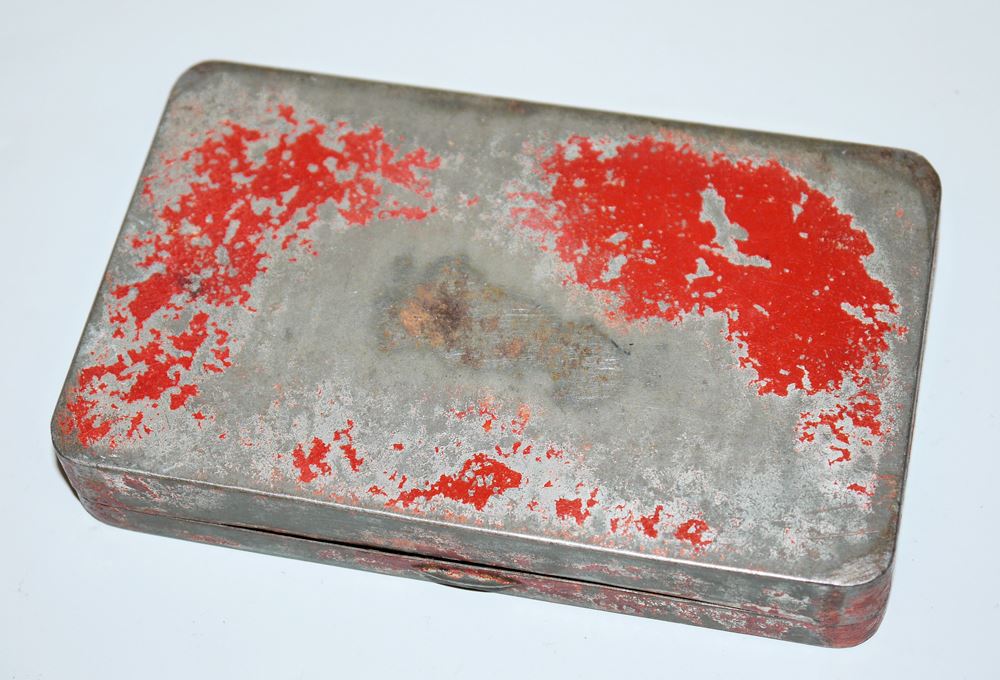 Blechdose mit Genremalerei einer musizierenden Gruppe, das Deckelbild recht gut erhalten, die Seiten und der Boden mit starken Lackverlusten, 8 x 13 x 2,5 cm