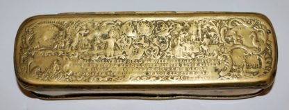 Johann Heinrich Hamer, Iserlohner Tabakdose mit Friedrich dem Großen, um 1760 Messing-Tabatiere mit geprägtem Dekor, auf dem Deckel ein niederländischer Trinkspruch, zwei Gesellschaftsszenen und die vier Kontinente, unterseitig in Medaillons Friedrich II. und der preußische Adler, die siegreichen Schlachten von Lowositz und Prag sowie eine Eloge, signiert I. H. Hamer (tätig 1754-1762), Dekor altersbedingt stellenweise berieben, 3,5 x 15,5 x 5 cm