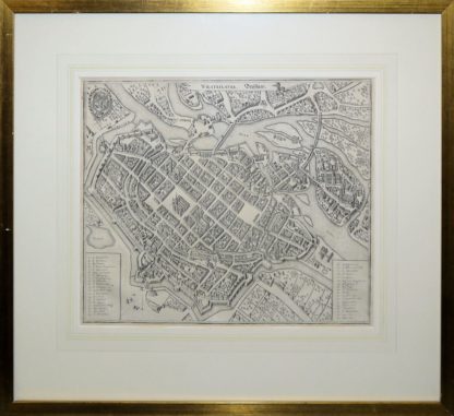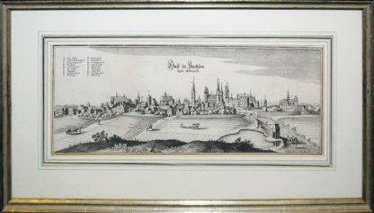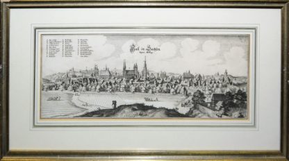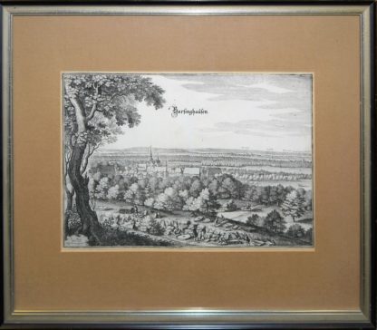 Matthäus Merian der Ältere,1593 Basel - 1650 Langenschwalbach, Schweizer Kupferstecher und Verleger, hier: "Wratislavia. Breßlaw". Kupferstich aus "Topographia Electorat. Brandenburgici et Ducatus Pomeraniae", 29 x 36 cm, Frankfurt am Main, 1652 // "Hall in Sachsen gegen Mittag" & "Hall in Sachsen gegen Mitternacht", 2 Kupferstiche, je 13,5 x 38,5 cm, Frankfurt am Main 1653 // "Barsinghausen", Gesamtansicht von Barsinghausen in Niedersachsen mit Blick auf die Ortschaft und die umliegenden Landschaft. Kupferstich aus: "Topographia und eigentlichen Beschreibung der vornembsten Stäte Schlösser auch anderer Plätze und Örter in denen Hertzogthumer Braunschweig und Lüneburg", 23,2 x 35,5 cm, herausgegeben in Frankfurt am Main, 1654 " Fritzlar -„Eigentliche Delineatio des (…) Feldlagers bey Fritzlar (...)” - eindrucksvolle Übersicht der Belagerung und Kampfeshandlungen rund um Fritzlar in Hessen, Kupferstich, Frankfurt am Main 1646, alle 5 Kupferstiche unter P.partouts gerahmt