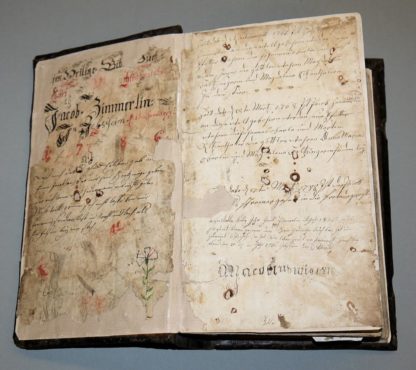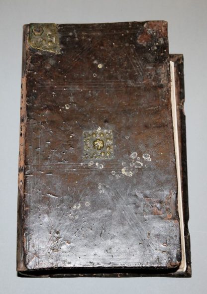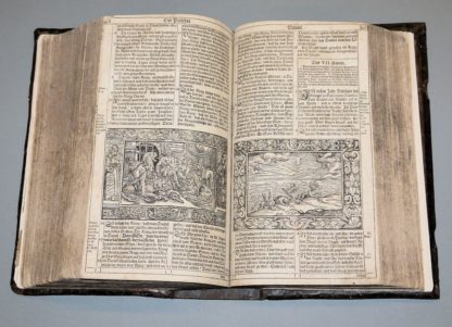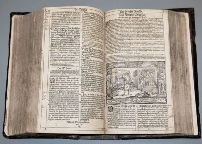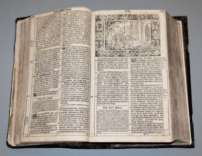 Das alte und neue Testament auf Deutsch, ohne Titelblatt, mit zahlreichen Kupferstichen, vorne Besitzereinträge ab 1768, im Ledereinband mit Bronzebeschlägen, Altersspuren, stellenweise stockfleckig