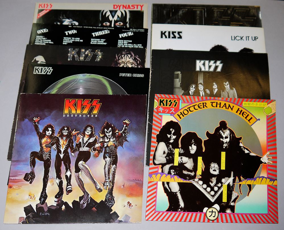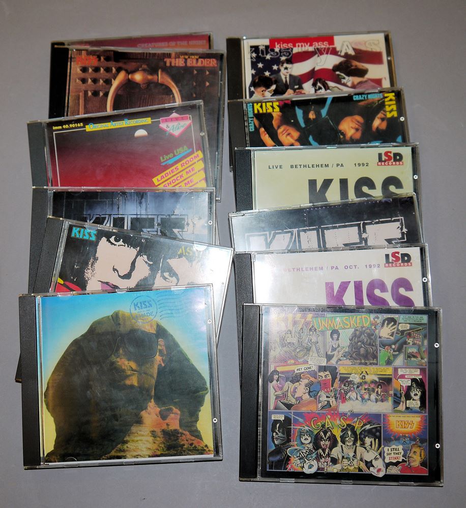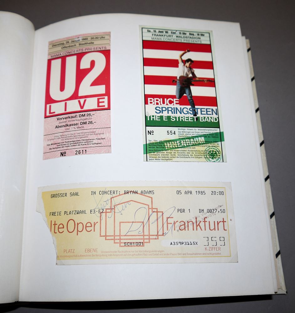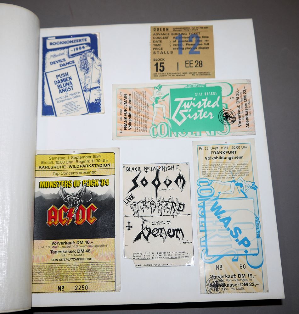 100 Eintrittskarten zu Konzerten internationaler Größen wie Kiss, Scorpions, Bon Jovi, Iron Maiden u.v.a., alle 1980er bis 1990er Jahre, gepflegt montiert in Fotoalbum, dazu von der legendären US-amerikanischen Hard-Rock-Band "Kiss", bekannt für ihre markante Kostümierung: 9 LP-Alben, 12 CD-Alben und 2 DVD sowie ein Stapel Fan-Poster und Hefte mit Bezug zu dieser extravaganten Rockgruppe