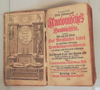 Antiquarisches zur Chirurgie von 1740, selten! Christoph Heinrich Keil, Compendiöses doch vollkommenes anatomisches Handbüchlein / darinnen alle und jede Theile des menschlichen Leibes in natürlicher Ordnung denen Anfängern der Chirurgie vorgelegt,.../ Bd. 2: ...Wie alle lehrbegierige Chirurgi sich in allen und jeden Verwundungen,... [2 in 1], Leipzig, Joh. Chr. Martini, 1740, 4. Aufl., 145 + 356 S. + Register, 2 Kupfer, im Halb-Pergament