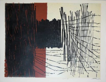 Volkmar Haase, 1930 Berlin - 2012 Brüssow, deutscher Bildhauer, ab 1951 Studium der Malerei an der Hochschule für bildende Künste in Berlin, zuletzt als Meisterschüler von Max Kaus. Hier: "20-63", Radierung, 43 x 39 cm, sign., dat. (19)63, betit.; "21-63", Radierung, 43 x 38 cm, sign., dat. (19)63, betit.; "25-63", Radierung, 43 x 38 cm, sign., dat. (19)63, betit.; "34 - Die Mauer", Farblinolschnitt, 64 x 46 cm, sign., dat. (19)61, num. 6/10, Rand etwas knickfaltig; "11", Farblinolschnitt, 64 x 54 cm, sign., dat. (19)61, num. 5/10, Rand etwas knickfaltig; "18", Farblinolschnitt, 55 x 75 cm, sign., dat. (19)61, Rand etwas knickfaltig, kleiner Einriss am linken Rand; "Gegensätzlich", Farblinolschnitt, 29 x 38 cm, sign., dat. (19)62, betit.; teils unter P.p. (Pachen Inv. Nr. 0424, 1778-1783)
