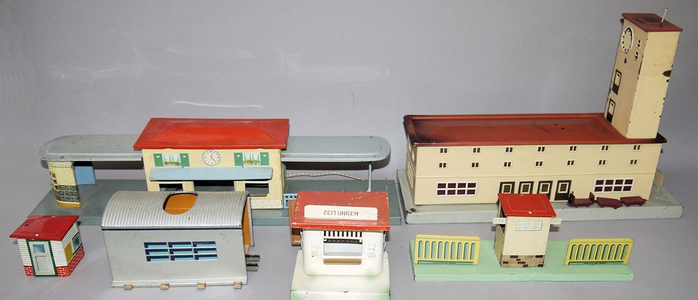 Umfangreiche Sammlung Spur 0 Eisenbahnzubehör, u.a. Bahnhöfe, Signale, 30 Teile verschiedene Hersteller Dreißig Teile Eisenbahnzubehör, verschiedene Hersteller u.a. Kolibri u. Bub, darunter Bahnhöfe, Signale, Übergänge, verschiedene Zustände, teilweise unvollständig u. bespielt, Selbstbesichtigung wird empfohlen