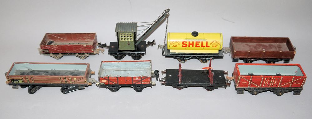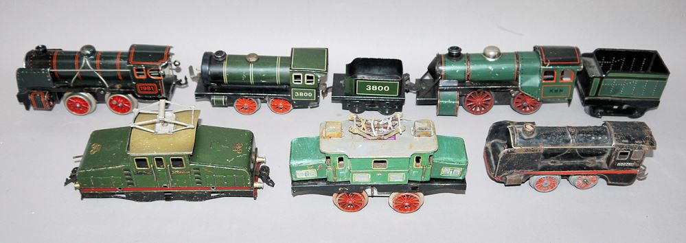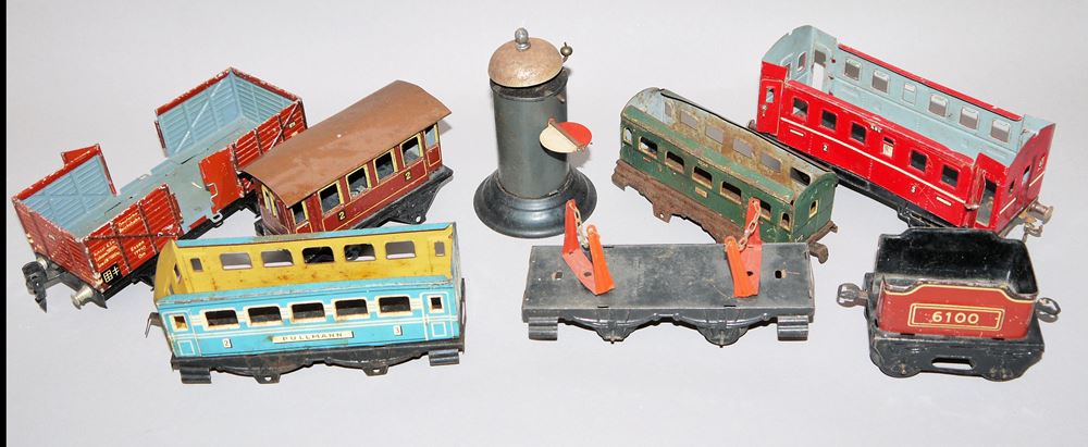 Eisenbahnkonvolut Spur 0 mit 6 Lokomotiven und 24 Teilen Zubehör, verschiedene Zustände, teils unvollständig, mit Alters- und Gebrauchsspuren, ideal für Bastler und als Sammlungsergänzung