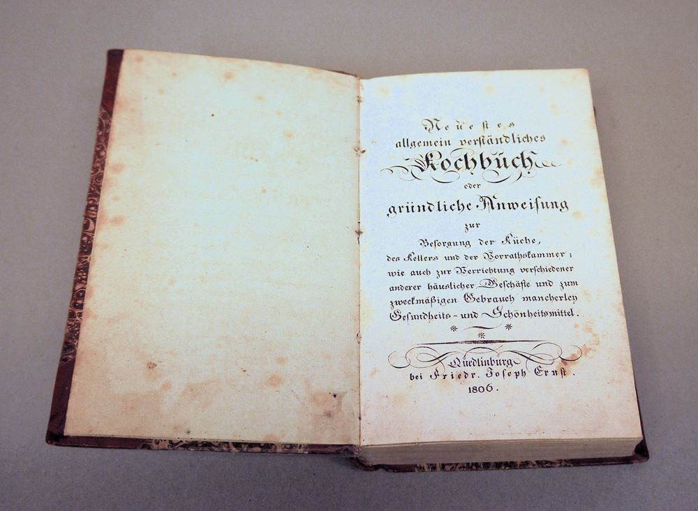Gründliche Anweisung zur Besorgung der Küche, des Kellers, ... und zum zweckmäßigen Gebrauch mancherlei Gesundheits- und Schönheitsmittel, 211 Seiten mit Register, Halbleder, Blätter in gutem Zustand, bei Friedr. Joseph Ernst, Quedlinburg 1806