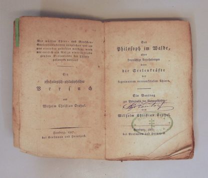 Wilhelm Christian Orphal, Der Philosoph im Walde, oder freymüthige Untersuchungen über die Seelenkräfte der sogenanten vernunftlosen Thiere, Hamburg, Großmann u. Horaczeck, 1807, 244 S., im Karton leicht fleckig, Benutzungsspuren