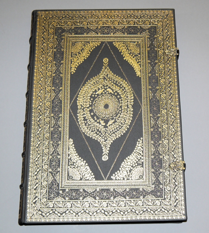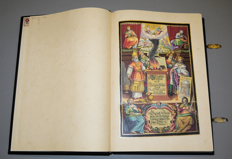 Faksimile der Matthäus Merian Kupferbibel von 1630 - die Fünf Bücher Mose und das Buch Josua, nach dem handkolorierten Exemplar Ausst. 303 der Stadt- & Universitätsbibliothek Frankfurt/Main, 55 Miniaturen Merians zum Alten Testament, Titelblatt mit Goldprägung, ziselierter Rundumgoldschnitt, Einband aus dunklem Leder mit feiner Goldprägung, 2 Metallverschlüsse & Faksimile der Matthäus Merian Kupferbibel von 1630 - "Das newe Testament durch D. Martin Luther verteutlicht mit Kupferstücken", nach dem handkolorierten Exemplar der Württembergischen Landesbibliothek Stuttgart, 77 Miniaturen Merians zum Neuen Testament, Titelblatt mit Goldprägung, Einband aus rotbraunem Leder mit feiner Gold- und Blindprägung, 2 Metallverschlüsse sowie 8 Eckbeschläge, je 44,5 x 31 cm, beide in sehr gutem und neuwertigen Zustand