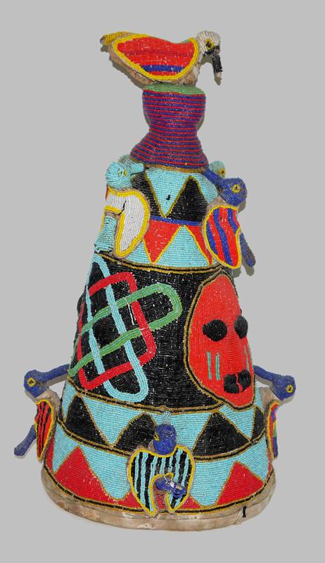 Hoher, konischer Kopfschmuck eines Yoruba-Herrschers, über ein Holzgerüst mit Stoffbespannung vollflächig benäht mit bunten Glasperlen, das Motiv zweier Maskengesichter, des endlosen Knotens und plastisch aufsitzend der königliche Vogel "Okin", H 53,5 cm