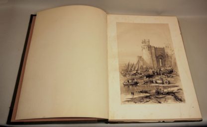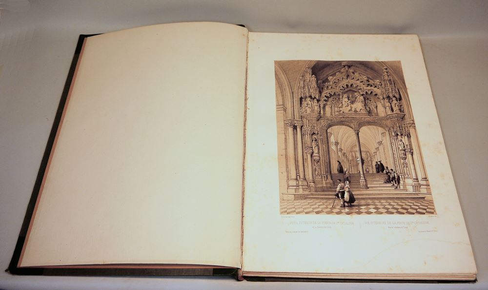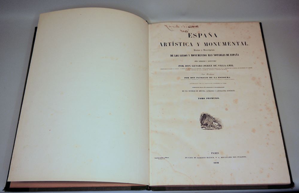 Don Genaro Perez de Villa-Amil (Jenaro Perez Villaamil), Espana Artística Y Monumental, 3 Bde., Vlg. Alberto Hauser, Paris, 1842-1850, 1. Band mit Text, Titel in einem Tafelband fehlend, mit 47 + 46 Tafeln, prachtvolle lithographische Ansichtenfolge von Städten, Kirchen, Märkte, Burgen, Häfen, Landschaften und andere Sehenswürdigkeiten Spaniens, mit architektonischen Details und Personen, einzige Ausgabe des Werkes, die Tafeln wurden in Paris bei Lemercier, Bernard et Cie. gedruckt und stammen von Adam, Arnout, Bachelard, Benoit u.a., nach Gemälden des Landschafts- und Architekturmalers G. Perez de Villa-Amil, Hofmaler der spanischen Königin Isabella, Text in Französisch und Spanisch, Foliant, im gepr. Halbleder, z.T. leicht stockfleckig