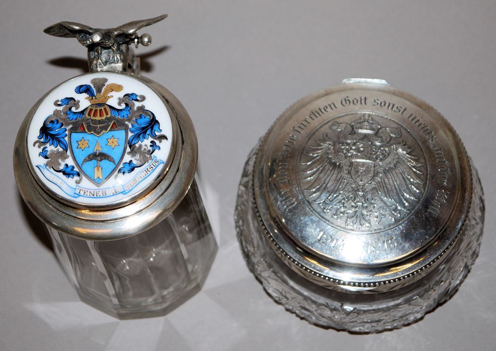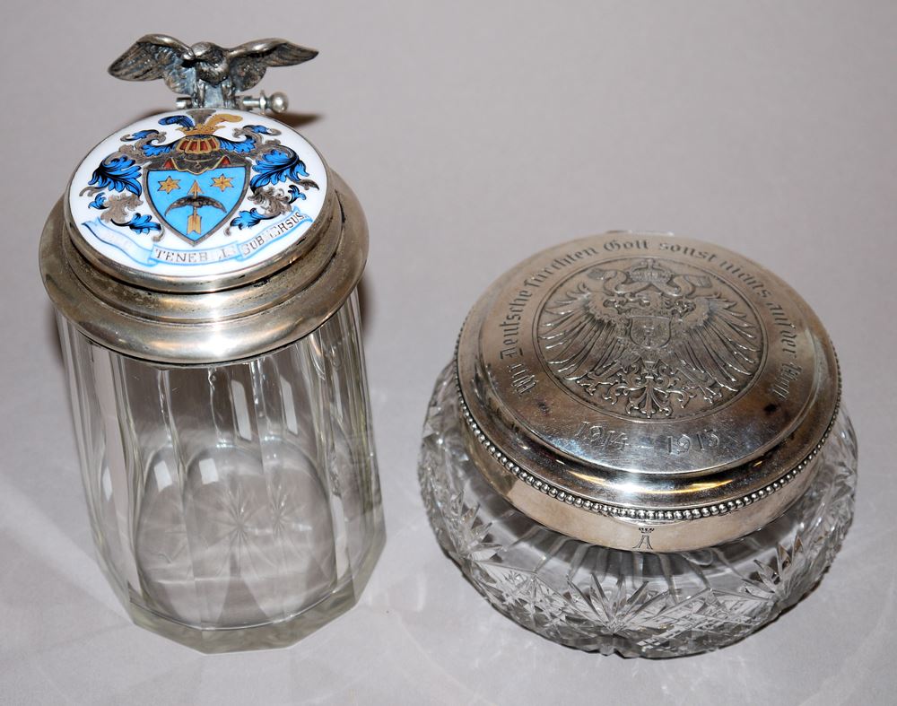 Bierkrug des Gutsritters Hermann von Somnitz und patriotische Konfektdose von 1915 Glaskrug mit silbergefasstem Porzellandeckel, bemalt mit dem Familienwappen derer von Somnitz (als Familie zu Bewersdorf 1372 erstmalig beurkundet), hier ein Krug des Hermann von Somnitz, (1857 - 1925), deutscher Verwaltungsbeamter und Rittergutsbesitzer in Pommern, H 15,5 cm, dazu eine Dose aus geschliffenem Kristallglas, der Deckel in 800er Silber von Wilhelm Binder, eingeprägt das Deutsche Reichswappen, umrahmt von dem berühmten Zitat Fürst Bismarcks und datiert 1914-1915, Dm 13 cm