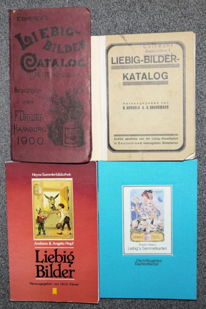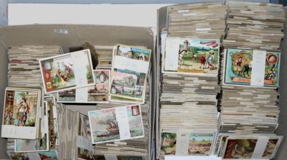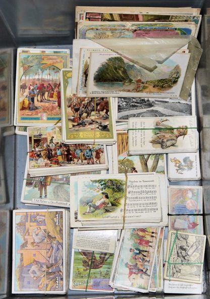 Wohlsortiert in Kartons eine stattliche Anzahl Liebig-Bilder, nach Serien sortiert und gebündelt, ca. 600 Serien, geschätzt über 3000 Bilder, dazu eine kleine Anzahl weiterer Bilderserien von Stollwerck, Erdal, Suchard u.a. kleinen Firmen, mehrere pharmazeutische Reklamepostkarten und vier Kataloge oder Sachbücher zum Thema (Katalog Dreser 1900; Arnhold/Grundmann 1930er Jahre; Robert Lebeck Bilderkatalog; Hopf, Heyne-Bibliothek)