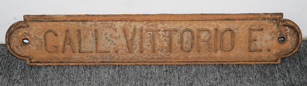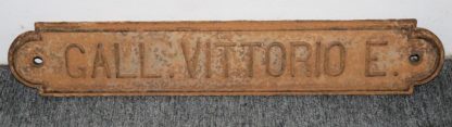 Ein gusseisernes Straßenschild der berühmten noblen Einkaufspassage Galleria Vittorio Emanuele II. in der Nähe des Mailänder Domes, benannt nach König Viktor Emanuel II., dem Einiger Italiens, sie wurde als kreuzförmige überdachte Galerie repräsentativer Bauten mit einer Überdachung aus Eisen und Glas bereits 1867 eröffnet, Gewicht des Schildes 18 kg, Maße 18 x 95 cm, Selbstabholung empfohlen