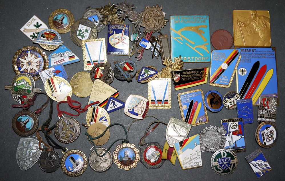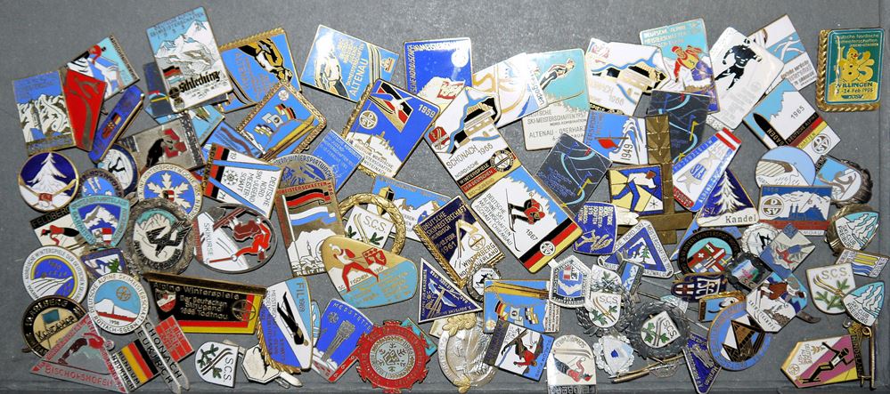 Große Sammlung seltener Wintersportabzeichen, überwiegend emailliert, 1927-1970, ca. 130 Teile
