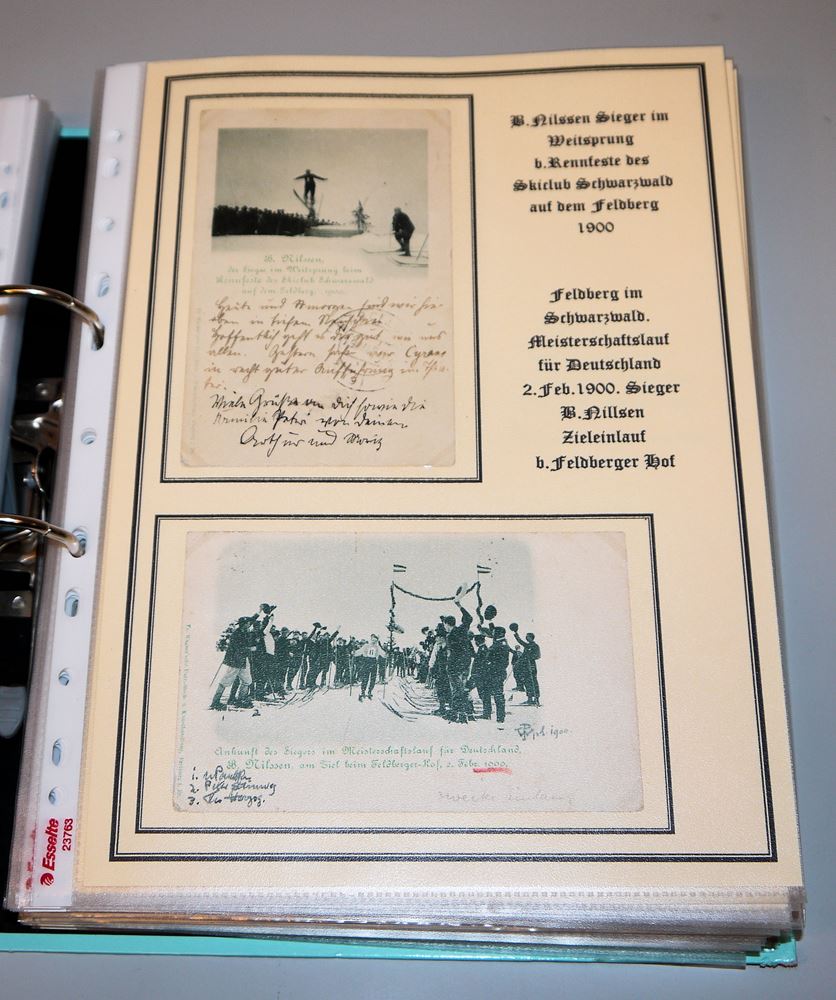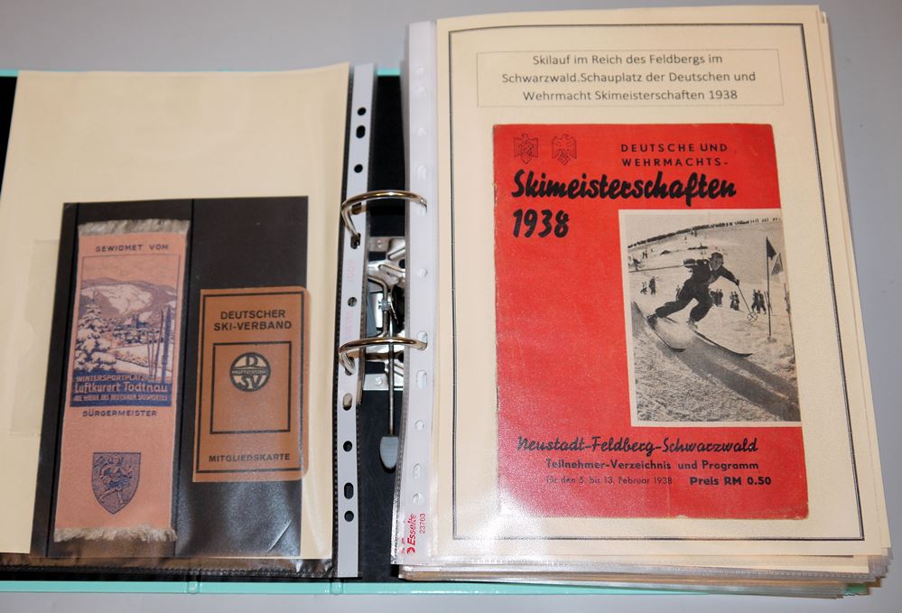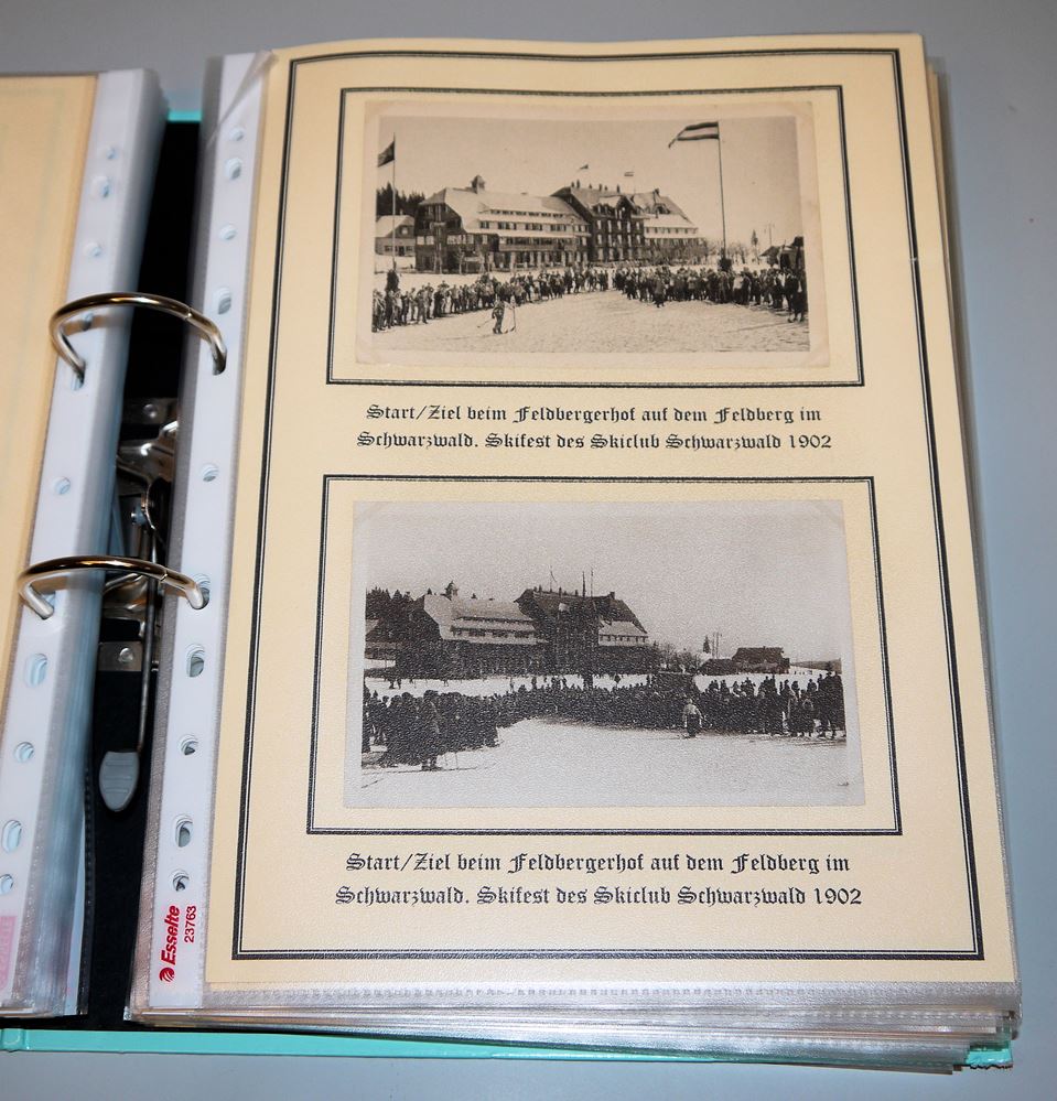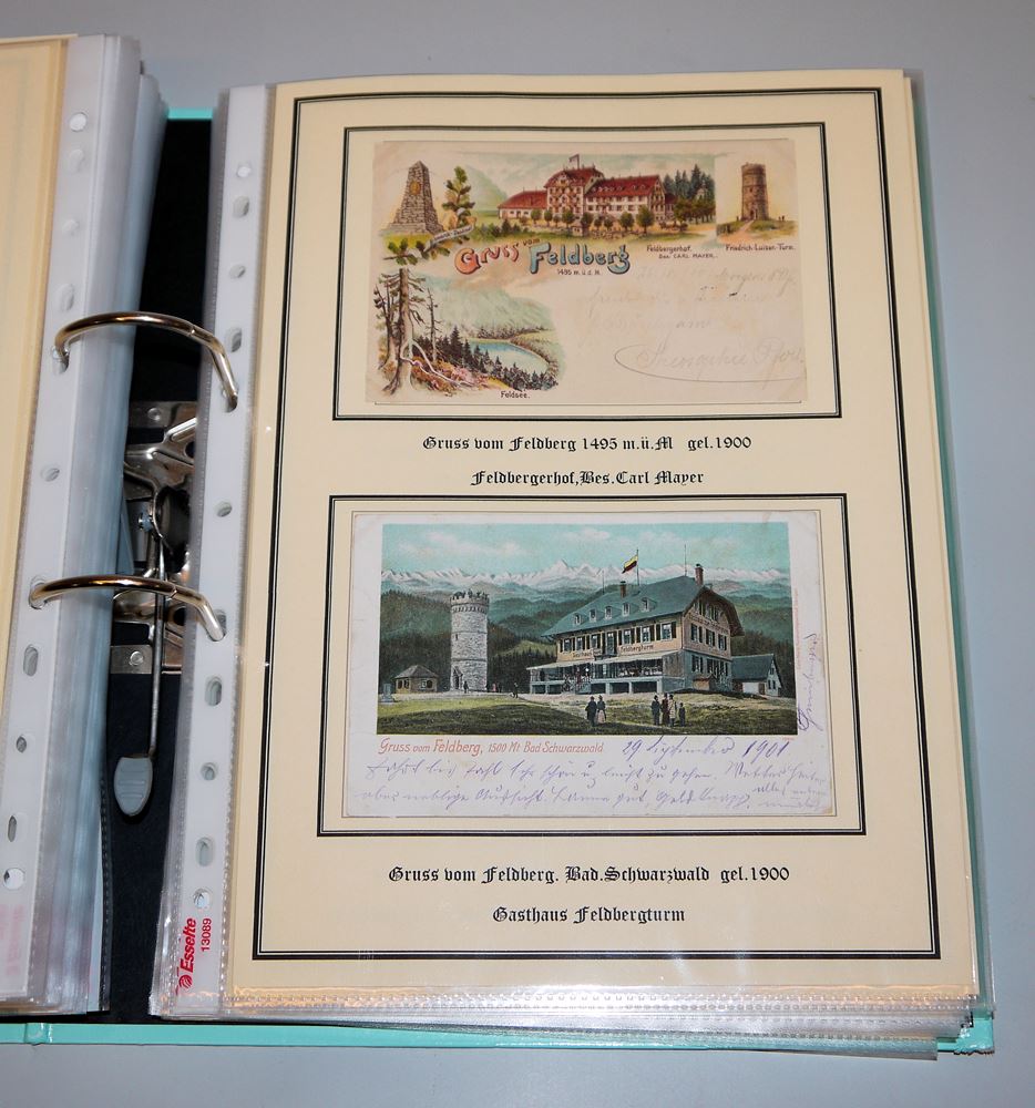 Seltene historische Sammlung zum Feldberg und Feldberger Hof, 1890-1938, ca. 150 Ansichtskarten u. Fotos Sammlung historischer Ansichtskarten und Fotografien zum Feldberg, Hotel Feldberger Hof, Todtnau und Umgebung, in der Sammlung u.a. enthalten: Abzeichen, Briefmarken, Eintrittskarten u. Prospekt zu den Skimeisterschaften 1938, dazu detaillierte Beschreibungen des Sammlers, Fotografien u. Postkarten mit Fotoecken fixiert.