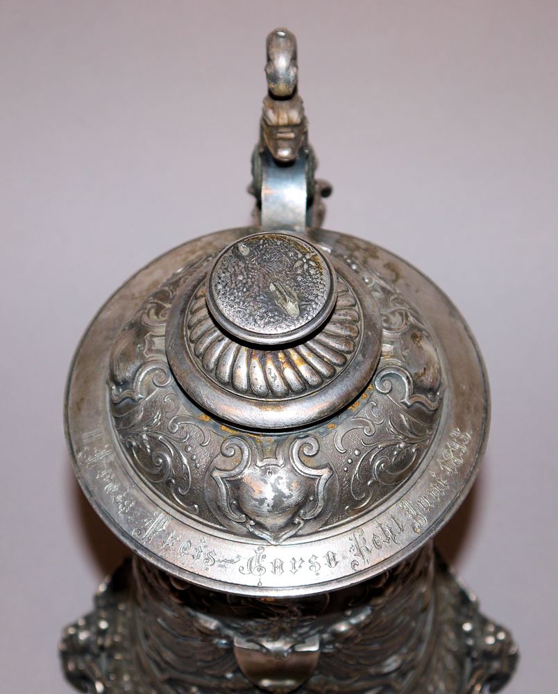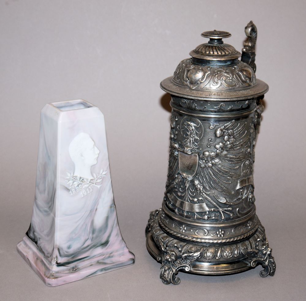 Reich gezierter Wappenkrug des Historismus aus Britannia-Metall, auf dem Deckelrand die Gravur "II. Preis Preis-Corso Kehl Juni 1893", H 28 cm sowie eine Porzellanvase von Königszelt, Schlesien, in Form eines Ehrenmals für Kaiser Wilhelm II. "1880-1913", marmorierte Glasur, rückseitig handschriftliche Widmung, H 19,5 cm